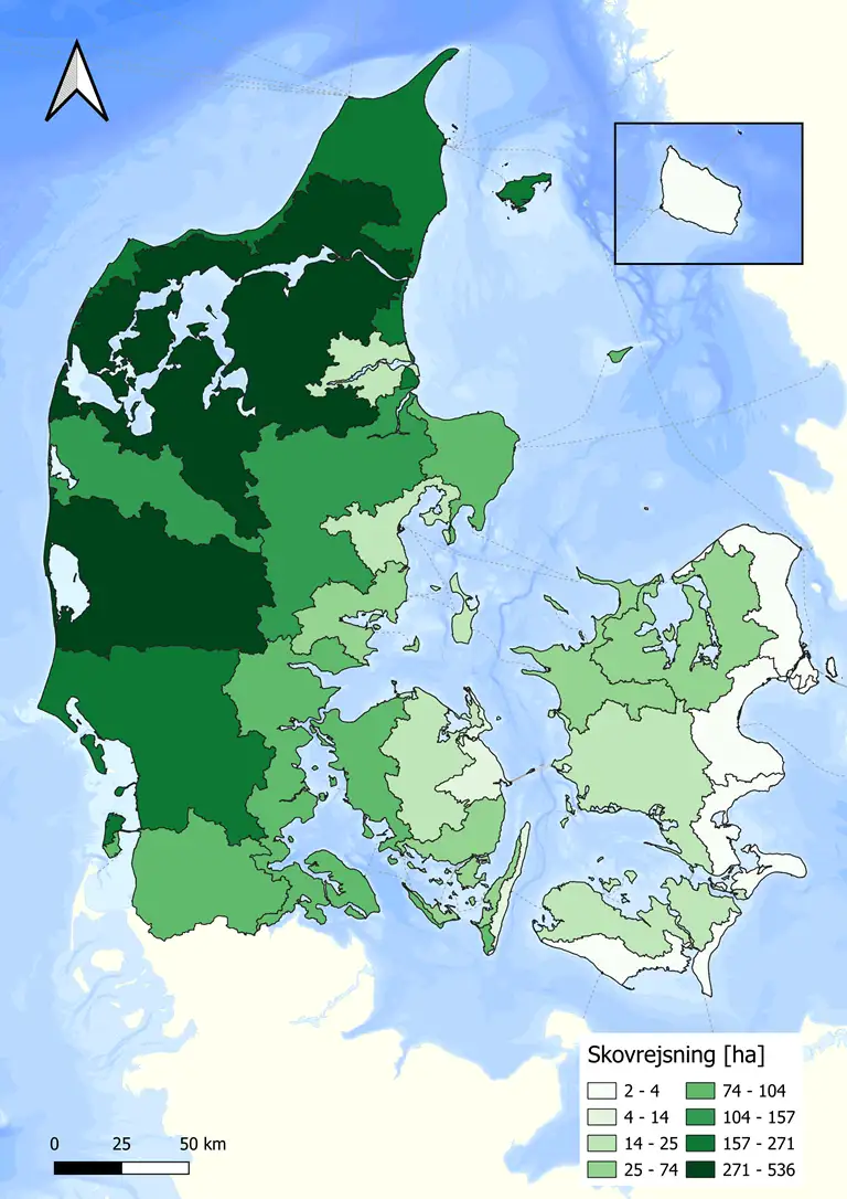 I 2025 var det især i de jyske lokale treparter, at blev der ansøgt om tilskud til mest ny skov. I de lokale treparter for Ringkøbing Fjord og Limfjorden blev der ansøgt om tilskud til hhv. 535 og 271 hektar skov.