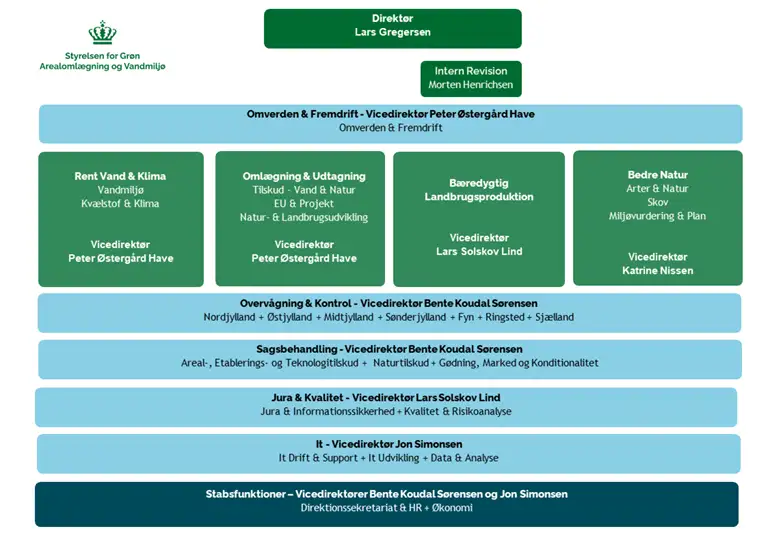 Væsentlige dele af Landbrugsstyrelsen og Miljøstyrelsen er blevet til Styrelsen for Grøn Arealomlægning og Vandmiljø. Styrelsen blev etableret under Ministeriet for Grøn Trepart den 25. september 2024. Se midlertidigt organisationsdiagram herunder.